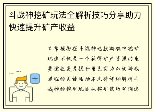斗战神挖矿玩法全解析技巧分享助力快速提升矿产收益